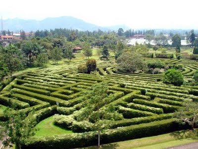Indonesia juga punya labirin, yaitu Labirin Taman Bunga Nusantara di Cipanas. Di tempat ini ada menaranya, sehingga kalau kita tersesat bisa minta bantuan.