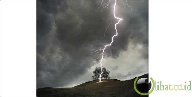 Ingin melihat bagaimana saat petir menyambar sebuah benda di bumi? Foto ini bisa mewakilkan. Bagaimana petir bercahaya terang tiba-tiba menyambar dari langit ke pohon. Kira-kira apa yang akan terjadi dengan si pohon ya? Mungkin gosong terbakar dengan sekejap.