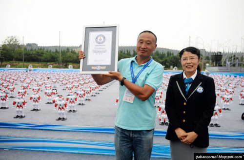 Agensi berita Xinhua melaporkan pada asalnya, sejumlah 1,040 robot yang setiap satu setinggi 43.8 sentimeter telah melakukan cabaran itu di bandar pelabuhan Qingdao.