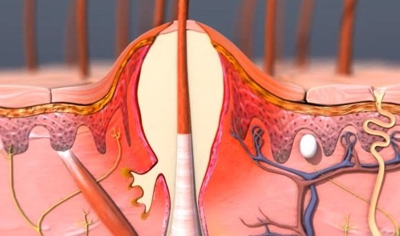 Ia juga merupakan jangkitan koloni P. Acnes (bukan Agnes Monica yer) dalam kelenjar minyak yang telah tersumbat dan menyebabkan ia bernanah.