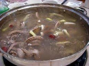 | Selain dibuat menjadi minuman beralkohol dan diminum darahnya, daging ular juga dapat diolah menjadi sup. Beberapa kedai makan di Hong Kong menghidangkan ular dalam sajian sup hangat selayaknya sup ayam. Daging ular yang telah dikuliti kemudian direbus hingga matang dan dibumbui. Sup ular sekilas memang menyerupai sup ayam. Sup ini biasanya ditambahkan jamur, jahe cincang dan rempah-rempah lainnya yang dapat membuat kaldu terasa hangat. |