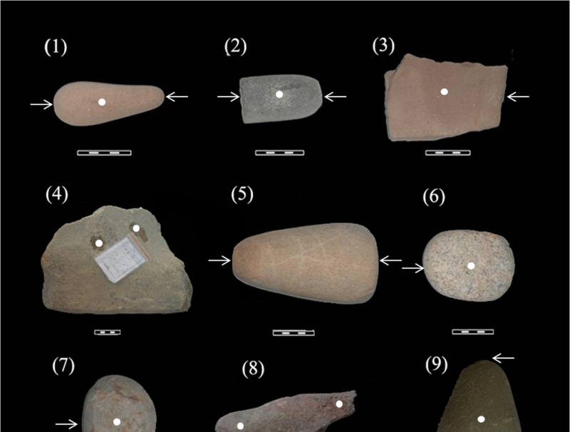 Stone tools examined for ancient starches. White dots and arrows indicate sampling locations.