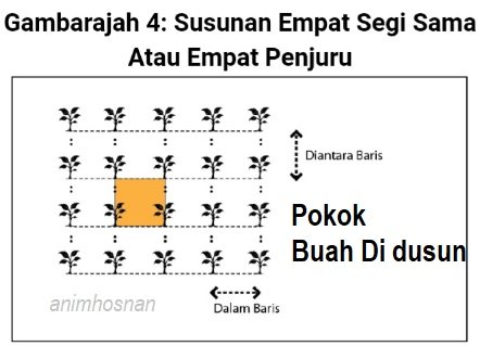 Dalam menanam pokok buah-buahan terdapat 4 sistem susunan penanaman yang biasa digunakan didusun seperti mana yang penulis blog sering membuat tinjauan. Ia terasuk Susunan Emapt Segi Sama (empat penjuru), Susunan Empat Segi Tepat, Susunan Tiga Segi Sama dan Susunan Tanaman Selingan Secara Siku-Keluang (Quincunx). Siastem Empat Segi sama ini biasanya digunakan untuk pokok buah-buahan kekal dimana terdapat sebatang pokok setip penjuru. Sistem ini membolehkan pokok ditanam disetiap penjuru dengan jarak yang sama (Sila lihat rajah disebelah). Memang mudah mengira bilangan kepadatan pokok sehektar kerana jaraknya sama. Sebagai contoh untuk pokok belimbing ditanam dengan jarak 6 meter 6 meter menjadikan julah kepadatan pokok belimbing sebanyak 277 pokok sehektar. Ia berbeza dengan sistem susunan empat segi tepat dimana jarak penanaman diantara barisan dan lebar tidak sama. Sebagai contoh penanaman pokok betik dengan jarak tanaman 2.5 meter x 3 meter menjadikan kepadatan tanaman bentik sehektar adalah 1,330 pokok. Sistem Tiga Segi sama dimana terdapat sebanyak 15% lebihan pokok dalam satu hektar berbanding dengan sistem empt segi sebab jarak digunakan boleh mengoptimakan jumlah pokok. Sebagai contoh bagi tanaman dokong tiga segi dengan jarak 10 meter x 10 meter memberikan jumlah kepadatan pokok dokong 115 pokok sehektar. Sistem Quincunx dimana ia mengamalkan konsep susunan empat segi sama tetapi ditmbah dengan tanaman selingan (Filler) dari jenis yang kecil dan cepat berbuah seperti pokok limau, belimbing, pisang dan jambu batu. Sistem ini memang sesuai digunakan dikawasan tanah yang subur serta memerlukan tahap pengurusan terbaik untk memberikan pulangan tinggi kpada petani.