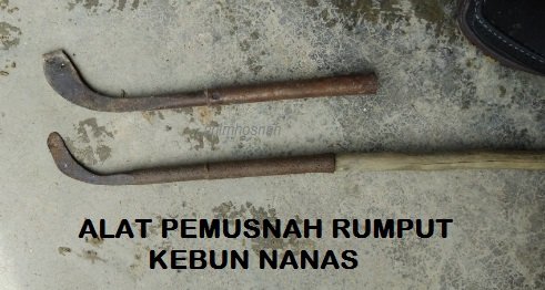 Lazimnya rumput yang degil dikebun nanas ada dua kategori. Kategori pertama jenis yang ada batang besar dan tumbuh menegak seperti Bayam Liar (Amarantah spp). Pokok ini cepat tumbuh dah tidak mati walau pun disembur racun jenis Gesapax, Tebunas atau pun Ameterex45. Bahan aktif sama ada Amethrin atau pin Diuron kurang berkesan membunuh rumput jenis ini. Jenis rumput kedua adalah yang mempunyai banyak biji dan akar dalam serta cepat tumbuh semula. Walau pun rumput lain telah mati jenis rumpai degil ini cepat hijau semula. Inovasi yang ditemui ini hanya menggunakan pisau toreh getah jenis tarik yang telah rosak atau patah pada matanya (Sila lihat foto disebelah). Pisau Toreh jenis ini yang baru dijual sekitar RM40 – RM45 satu unit dikedai pertanian. Ia adalah diperbuat daripada logam berkualiti yang tajam digunakan untuk menoreh getah. Pisau ini dibengkokkan dibahagian hujung matanya sehingga membentuk separuh bulatan seperti sabit dan ditajamkan dibahagian depan dan belakangnya. Perkara ini boleh dilakukan dikedai besai atau dengan tukul dibuat sendiri dan yang penting ia diasah dengan batu asah sehingga taja. Pisau yang beratnyanya sekitar 250-300 gram ini amat tahan dan tidak mudaah bengkok. Ia kemudian disambung dengan batang kayu yang kuat sepanjang 1.5 – 1.8 meter pada pangkal pisau tersebut dengan kukuh.