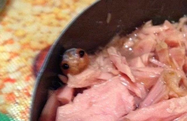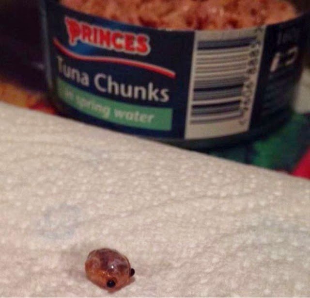 Narayana 734 – Coba anda bayangkan ketika anda ingin makan ikan tuna kalengan. Ketika anda buka kalengnya tiba-tiba tampak sesuatu di dalamnya, seperti gambar di atas. Kelihatannya seperti ulat.