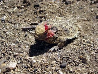 Kadal ini berjuluk “kodok bertanduk”, tubuh gemuk meliputi tanduk pelindung yang tebal dan duri. Mendiami lahan kering, lingkungan berpasir, mereka makan semut dan yang mengagumkan membanggakan salah satu mekanisme yang paling mengerikan pada perthanan alam , ketika ketakutan, beberapa spesies dapat mengalirkan tekanan darah di kepala mereka sampai pembuluh kecil di sekitar mata mereka pecah, menyemprotkan aliran darah kepada si penyerang. kemungkinan sejenis darah yang asam ini diambil dari asam pada semut, memungkinkan mamalia predator tahu bahwa menyerang kadal gemuk ini hanya membuang-buang waktu mereka. namun Sayangnya, burung tidak terlalu perduli dengan semprotan kecut ini.