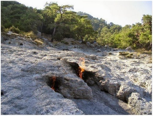 Kira-kira 80 km sebelah barat daya dari ibu kota Provinsi Turki ” Antalya ” , bersebelahan dengan bandar Cirali di sebelah barat daya Turki , Ada batu yang terus menyala ini terletak di sebuah gunung yang berbatu dan didalam batu itu terus mengeluarkan Api yang menyala selama ribuan tahun lamanya.