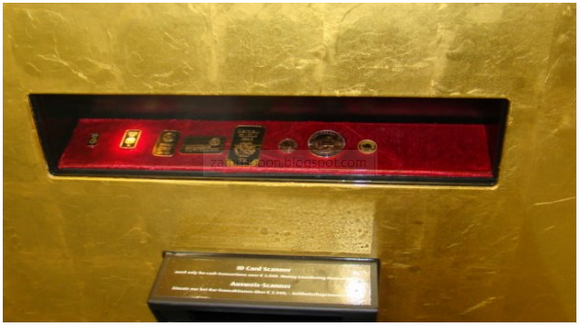 Mesin itu dijaga oleh pengawal bersenjata lengkap, ATM berkilauan warna emas ini mengeluarkan emas 24 karat dalam 320 bentuk yang berbeza, dari jongkong emas , syiling perhiasan dengan berat yang berbeza-beza.