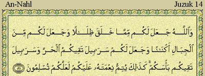 Dan Allah telah jadikan untuk kamu apa-apa dari dzilaalan yang telah Dia ciptakan. Dan Dia jadikan untuk kamu (bahan-bahan) dari bukit-bukau sebagai (bahan-bahan) penutupan (perlindungan dan keselamatan) , dan Dia jadikan untuk kamu pakaian untuk memelihara dari kepanasan (tenaga getaran) dan pakaian untuk memelihara(melindung) dari tenaga kekuasaan yang sangat hebat kamu (seperti pencemaran radiasi yang dilakukan oleh manusia), demikian itu Dia telah sempurnakan nikmatNya ke atas kamu semoga kamu menyerah diri (sentiasa menjadi selamat). An-Nahla 16:81