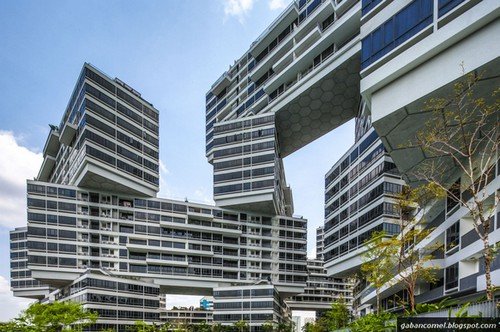 Bukan hanya terkumpul biasa, bangunan-bangunan itu kelihatan bertindih dengan angle yang bebeza-beza. Reka bentuk yang demikian membuat bangunan tersebut kelihatan sangat futuristik.