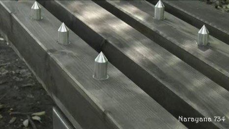 Untuk mencegah orang yang mau duduk tapi tidak mau bayar, bangku ini dilenkapi dengan besi-besi tajam di atas dudukan sehingga siapapun tidak akan mau duduk kecuali bokongnya mau bolong. 🙂