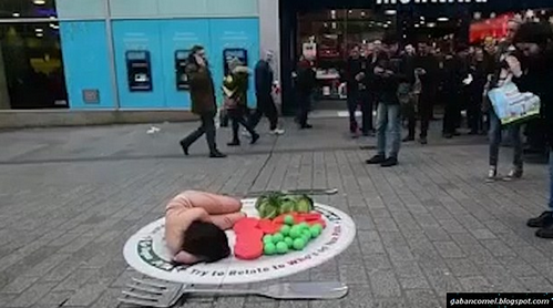 Seorang wanita bertelanjang bulat di pusat bandar ini dan berlingkar di atas pinggan sebagai membantah pemakanan ayam belanda sempena sambutan Krismas.