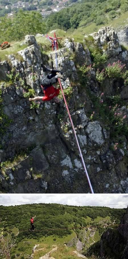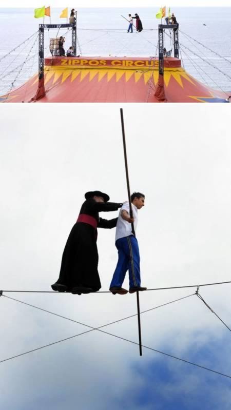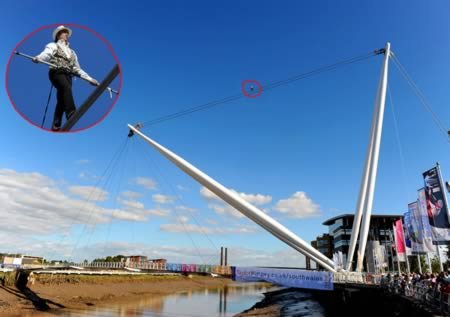 | Daredevil Olivier Roustan performs the highest ever tight rope walk in Europe and crosses the 250ft high rope over the River Usk in Newport, South Wales. |