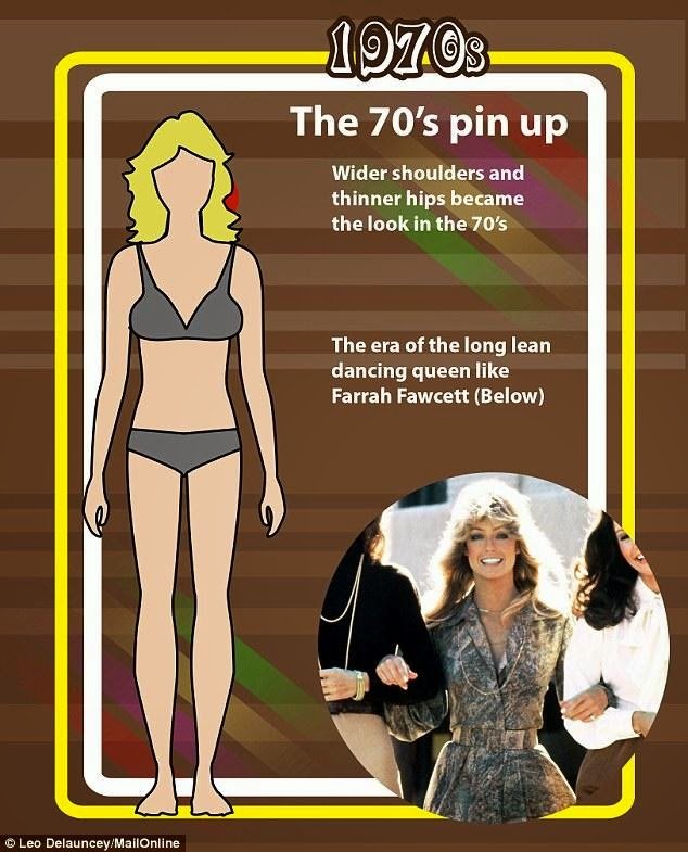 Tubuh curvy masih diminati, namun lebih ramping dibanding era 1950an. Aktris 70an, Farrah Fawcett, menjadi role model-nya.