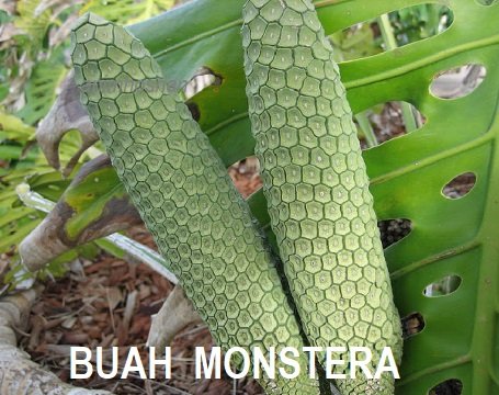 Buah Monstera adalah unik bentuknya seakan buah jagung atau yang tirus seperti buah nanas. Ia mempunyai saiz buah sekitar 25 cm panjang dan 3-4 cm garispusat yang berwarna hijau kulitnya. Apa yang unik pada pandangan penulis blog bagaimana bentuk hexagonal pada bahagian kulitnya (Sila anda melihat foto disebelah, diatas dan dibawah sekali). Kulit buahnya apabila masak dn dikupas menghasilkan isi berwarna putih yang mana ia memberikan bau atau aroma enak kombinasi antara Buah Nanas (Ananas comosus) dengan bau Buah Pisang (Musa spp). Buah monstera dikelaskan sebagai jenis buah yang boleh dimakan dan selamat dimakan manusia. buahnya mengandungi bahan seperti Raphides dan Trichosclereds iaitu berbentuk struktur kristal dari Kalsium Oksalate. Ia terkandung dalam buan monstera uda atau belum masak dan menyebabkan kegatalan pada mulut. Sebaiknya hanya makan buah monstera yang telah masak sahaja apabila warna kulitnya menjadi kekuningan (yellowish). Buah yang masak akan menghasilkan bau wangi kuat dan sesuai dimakan tetapi buah ini sebenarnya memang cepat rosak. Cara buka buah ini dengan potong menggunakan pisau dan kemudian isinya boleh dikupas dengan mudah. Makan buah ini dengan mengambil isinya dengan kaedah seperti makan buah nanas. Elakkan makan buah monstera yang muda atau belum masak sebab boleh menyebabkan kehilangan suara dan getah pada buah muda serta daun menyebabkan kegatalan pada kulit. Pokok monstera yang ditanam dinegara beriklim temperate sahaja yang berbuah sementara dikawasan tropika sukar berbuah. Semuga tulisan ini memberi info berguna kepada semua pembaca anim agro technology kali ini. Wasallam!!!..