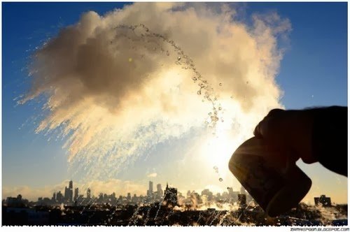 Dua hari yang lalu, kerana suhu turun menjadi-14F atau -25 celcius, Scott Harrison melemparkan sebaldi air panas ke udara. “Seorang rakannya mengatakan bahawa air panas berubah menjadi awan jika suhu udara cukup sejuk,” dia memberitahu kami, “jadi saya memutuskan untuk mencuba sendiri.