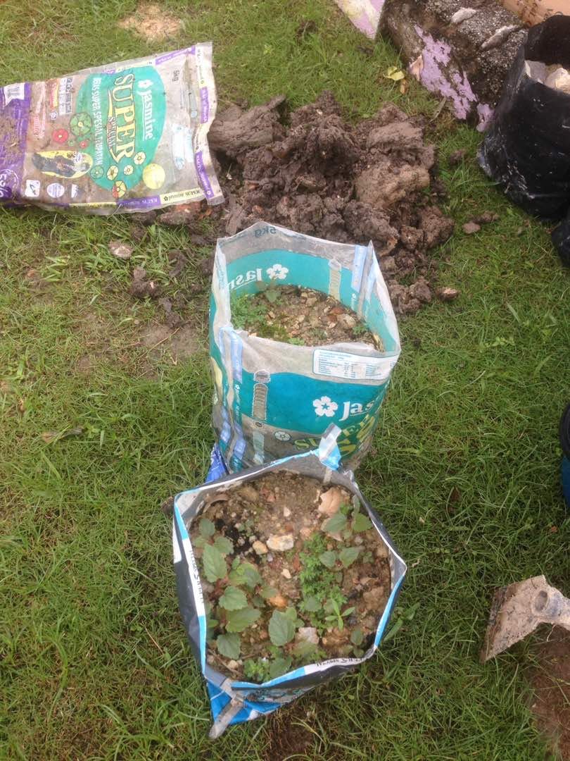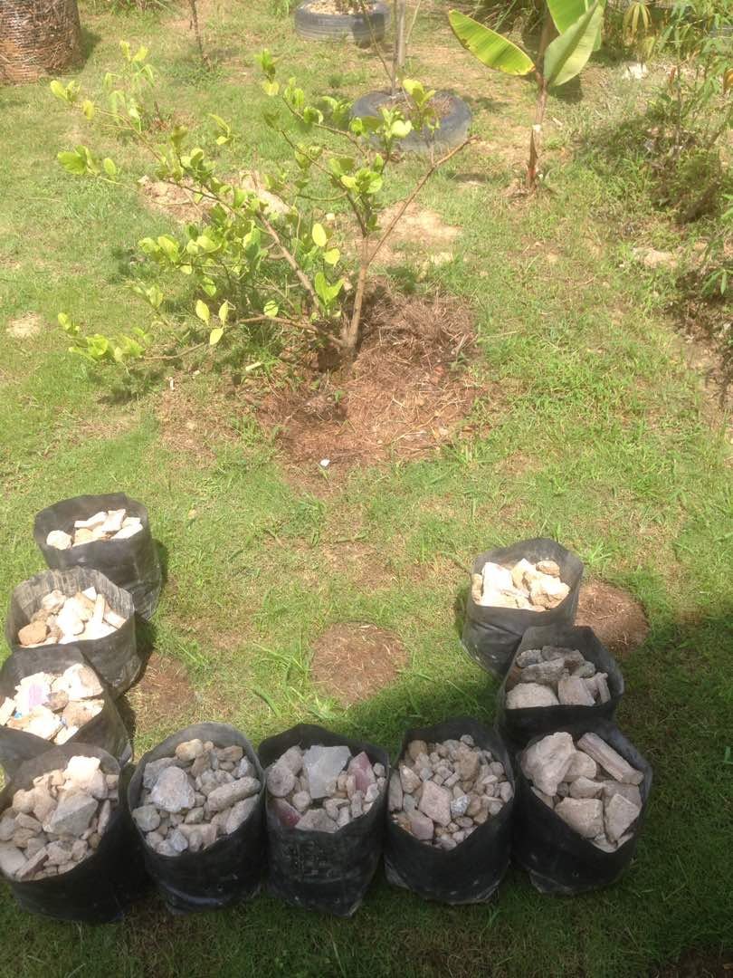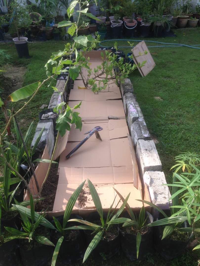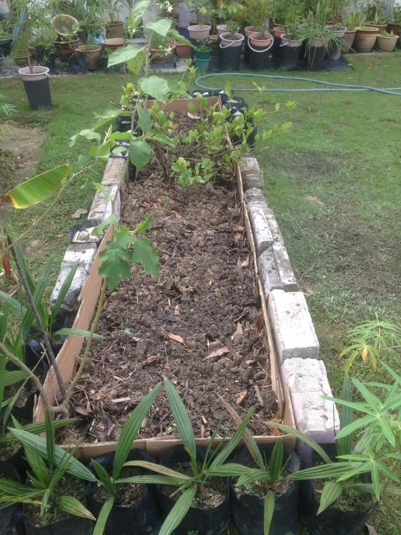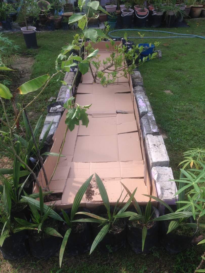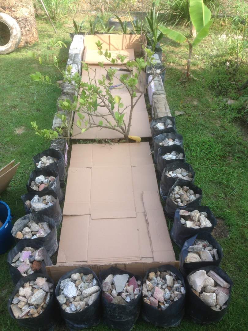 Menggunakan bahan2 sisa pembinaan, beg poli, batu2 serta daun2 kering, potongan rumput, kotak kertas dan tanah halaman rumah.