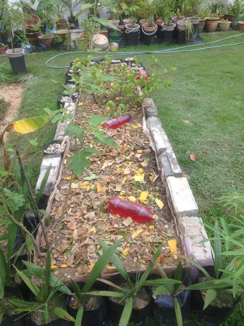 Bahan2 kompos seperti daun2, potongan rumput dan sebagainya yang telah diracik atau dipotong kecil boleh di tabur ke atas batas timbun dan juga dikomposkan.