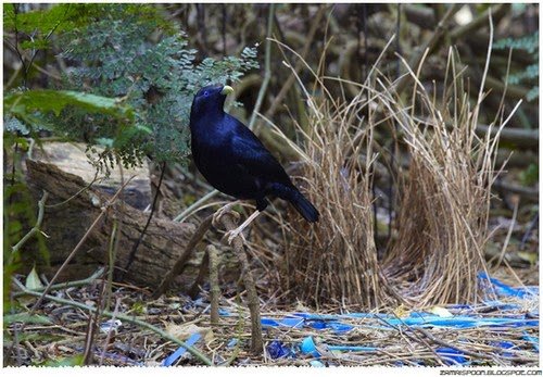 Menurut kajian , rupanya burung betina lebih tertarik dengan warna biru yang jarang ditemui di persekitaran mereka . Jika burung jantan boleh mengumpul warna biru maka akan kelihatan lebih menarik . Namun persaingan yang senggit akhirnya sarang yang indah saja tidak cukup dan membuat burung jantan perlu menari untuk menarik perhatian . Biasanya itu dilakukan ketika burung betina melawat sarangnya untuk kedua kali setelah menilai keindahan pembinaan .