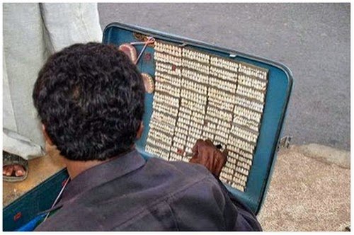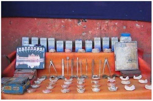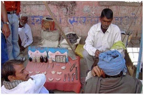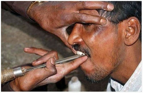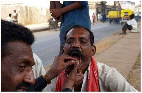 Seorang doktor gigi jalanan yang juga penganut agama hindu, Ramje Sao, 75 tahun, membuka mulut pesakit untuk memeriksa keadaan gigi di klinik gigi jalanan di India, beberapa waktu yang lalu.Jom saksikan foto -foto doktor jalanan di india merawat pesakit cara tradisional.
