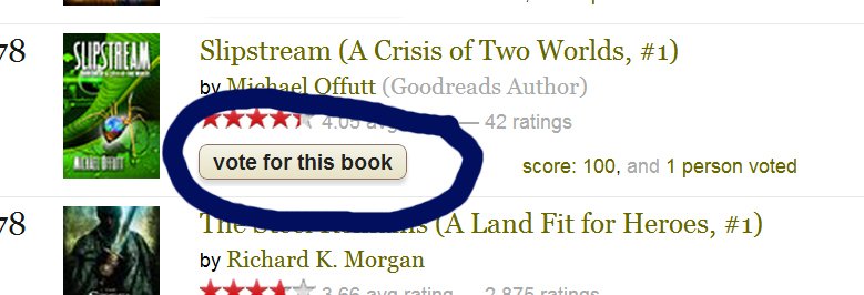 So the social networking site for book lovers called Goodreads has these lists for books (you may have seen them if you are on that site), and I’m tired of “Slipstream” being mediocre in all of them. Just in one, I would like to be higher, maybe even number one. So I picked out one that I think isn’t going to step on any of my fellow author’s toes (at least the ones with whom I regularly network).
