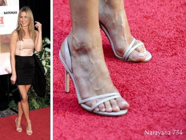 | Jennifer Aniston memang disebut-sebut sebagai salah satu seleb dengan tungkai kaki terindah, namun terlalu sering memakai sepatu berhak tinggi membuat urat-urat di kakinya menonjol. |