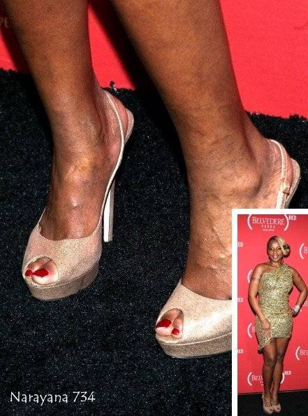 | Mary J. Blige mungkin harus mulai mengurangi pemakaian high heels supaya urat-urat kakinya tidak muncul dan membiru. Plus, sedikit body lotion juga bisa membantu. |
