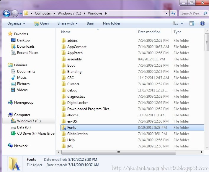 10) kalau nak make sure proses install font ini menjadi korang boleh check sendiri.. korang tgk macam gambar di bawah nie ok..kalau folder yang korang paste tu ada..maka awak berjaya la install font tu kedalam komputer..