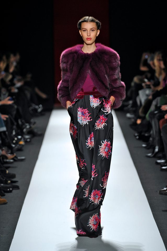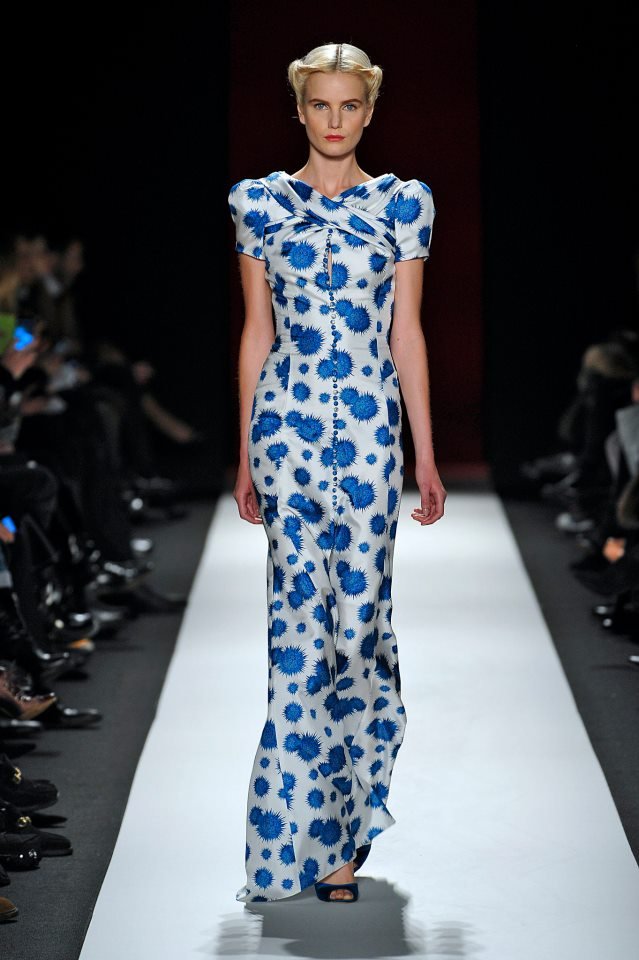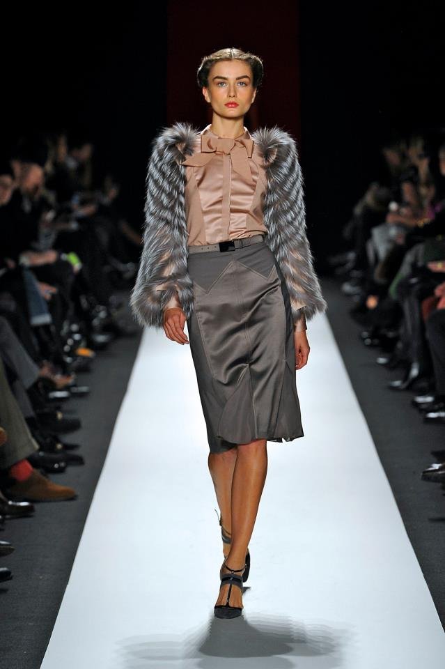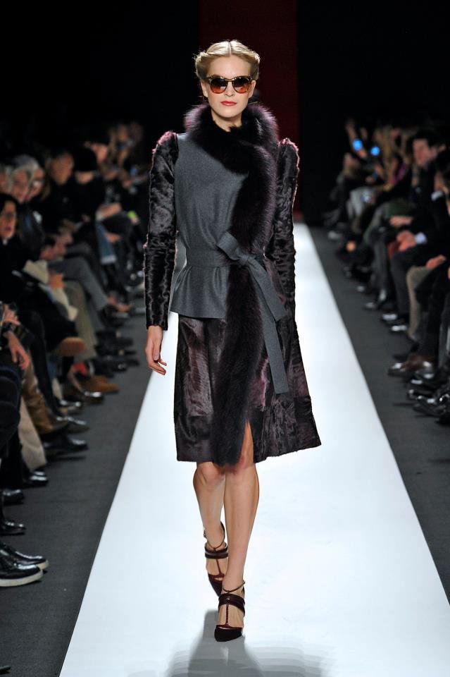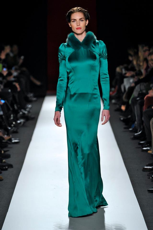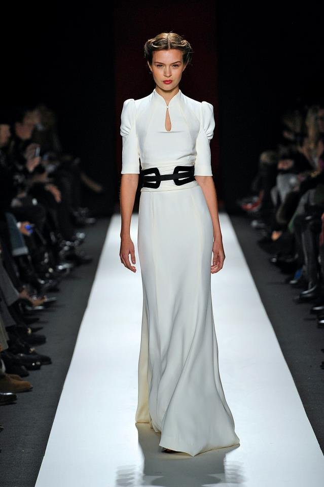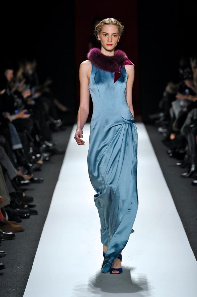 Dresses and gowns with high keyhole necklines had defined shoulders and teeny belted waists that highlighted the graceful movement of the fluid crepe skirts. Another beauty came in light blue silk charmeuse with a purple fox-fur collar. Sometimes, however, the add-ons were too much; one gown looked like it had two flower urchins tacked on its crisscross straps.
