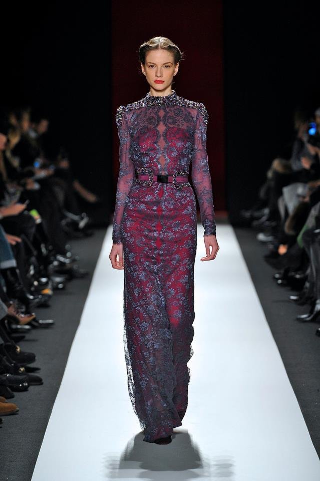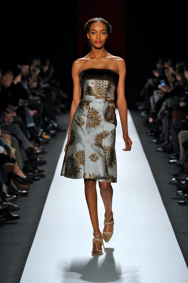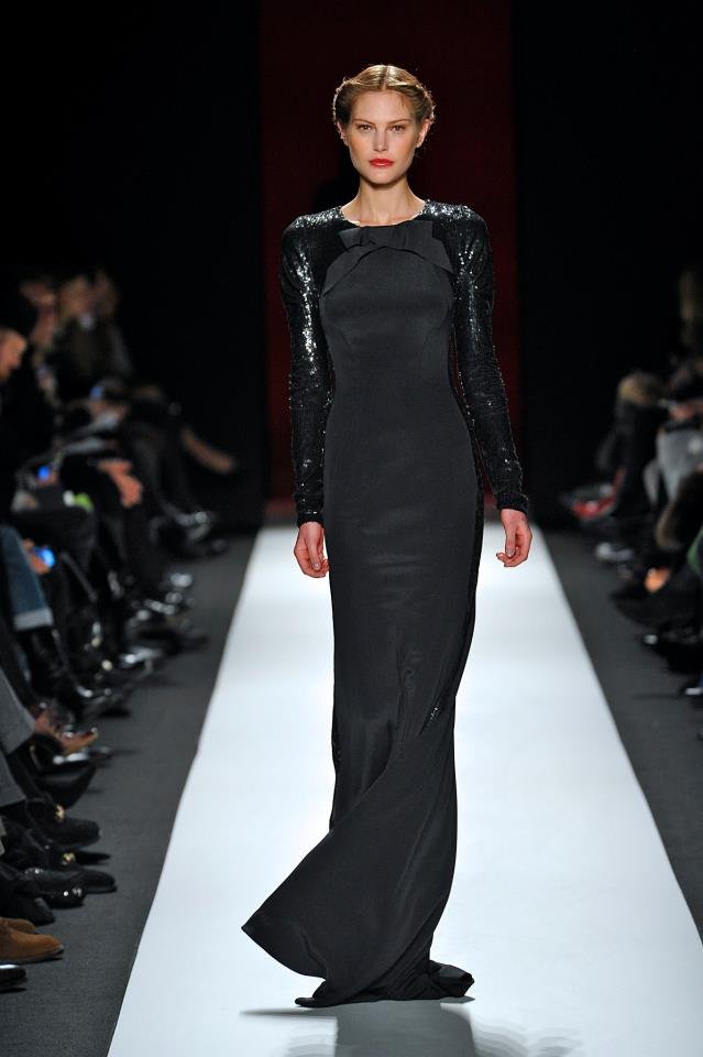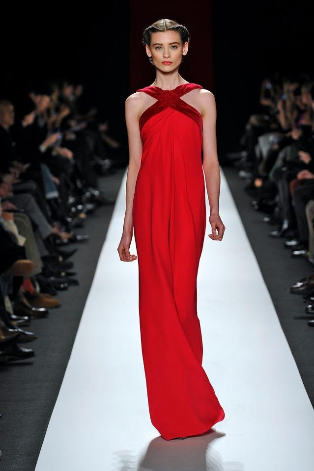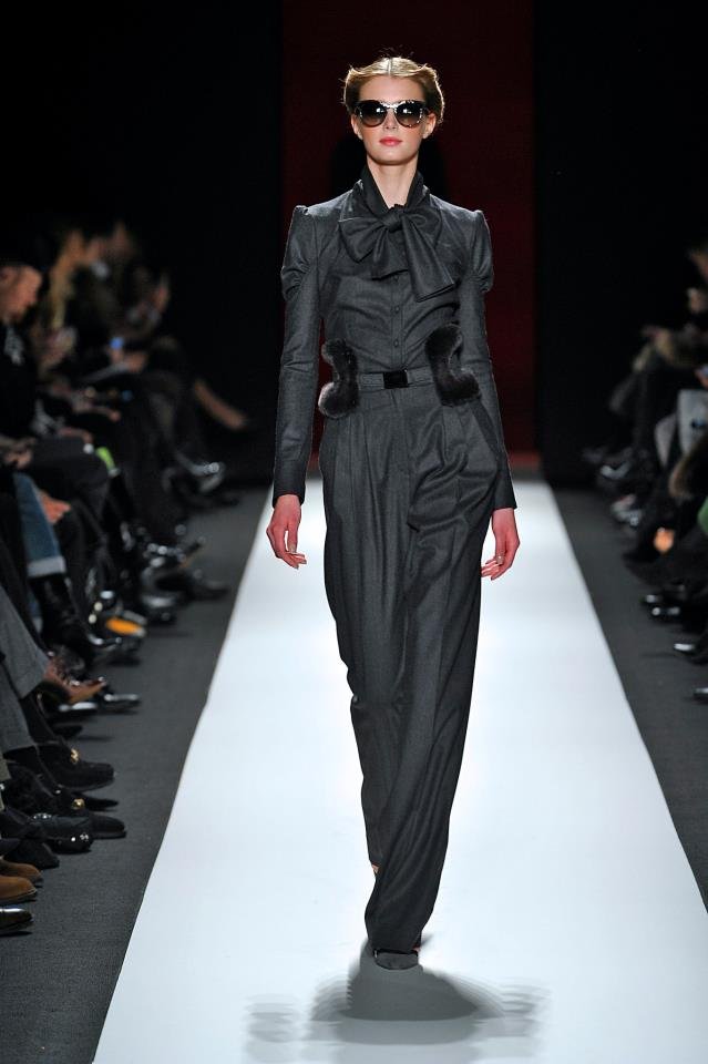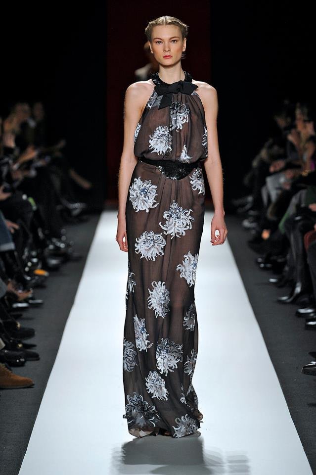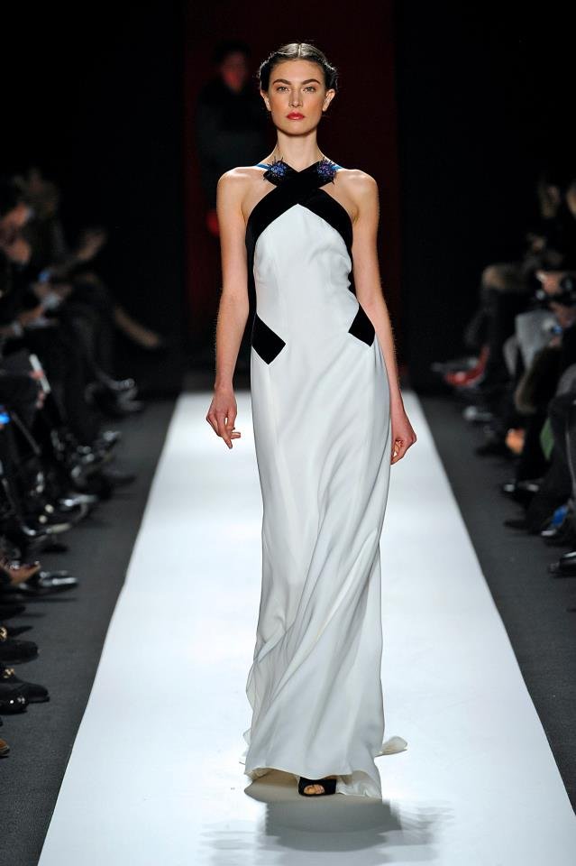 Dresses and gowns with high keyhole necklines had defined shoulders and teeny belted waists that highlighted the graceful movement of the fluid crepe skirts. Another beauty came in light blue silk charmeuse with a purple fox-fur collar. Sometimes, however, the add-ons were too much; one gown looked like it had two flower urchins tacked on its crisscross straps.