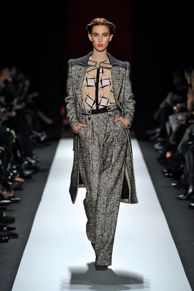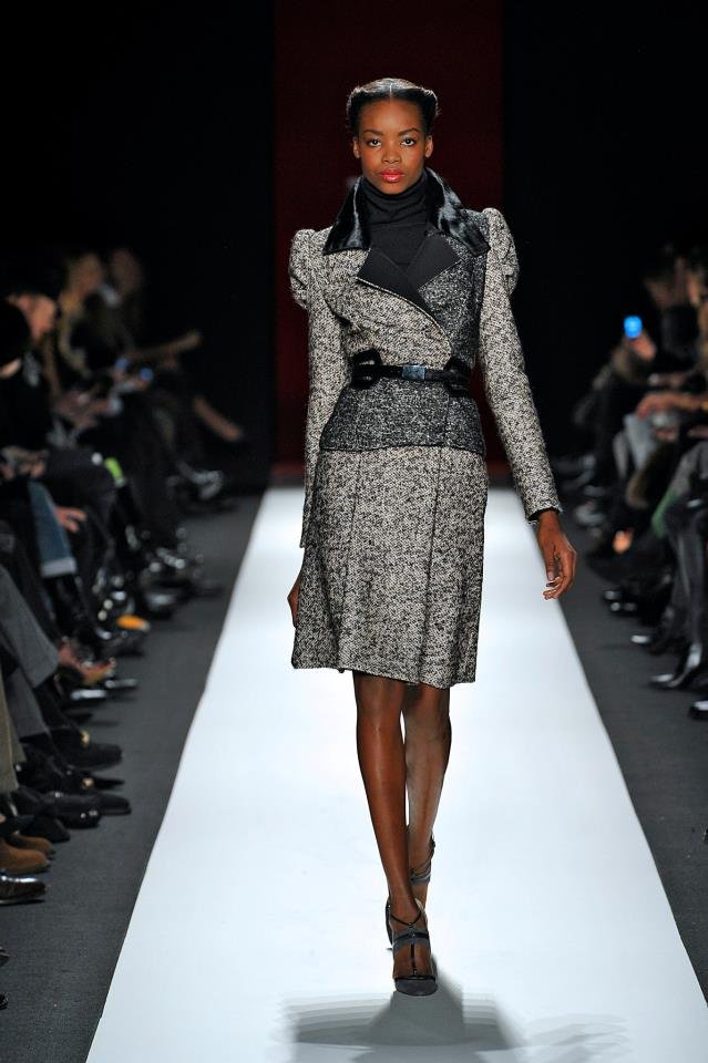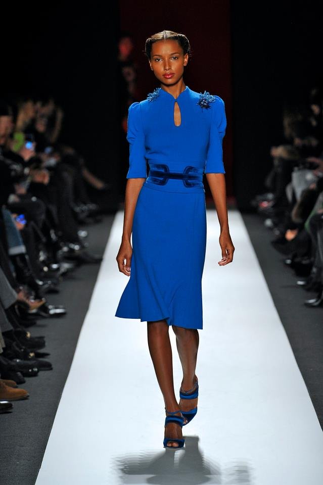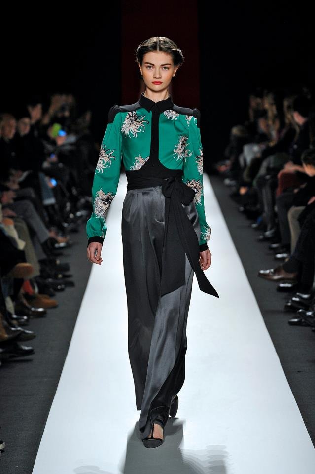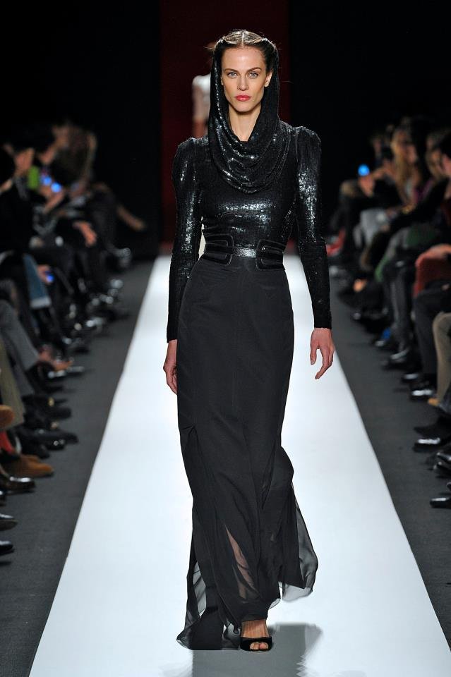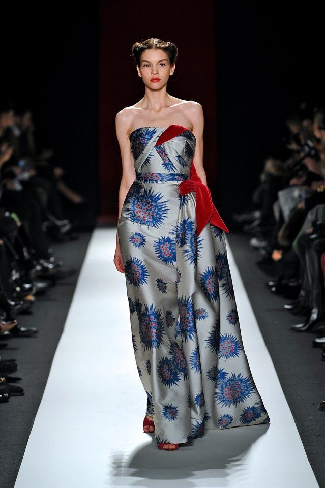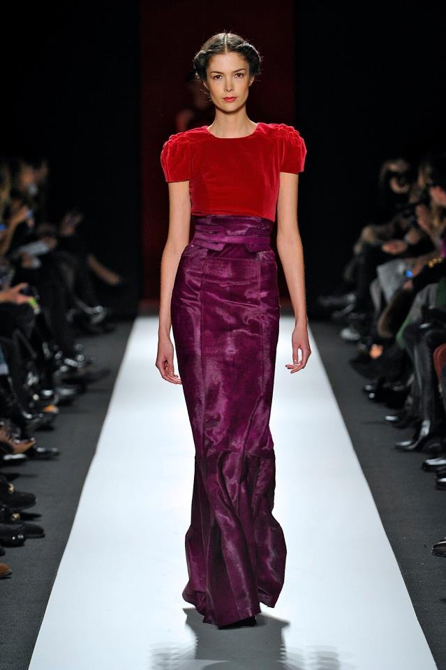 Dresses and gowns with high keyhole necklines had defined shoulders and teeny belted waists that highlighted the graceful movement of the fluid crepe skirts. Another beauty came in light blue silk charmeuse with a purple fox-fur collar. Sometimes, however, the add-ons were too much; one gown looked like it had two flower urchins tacked on its crisscross straps.