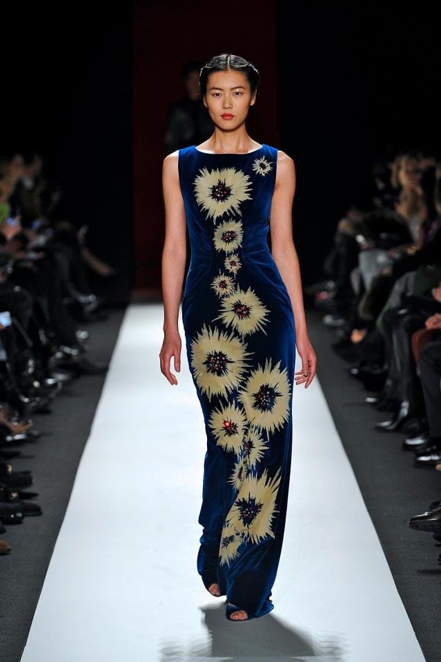 Developing her own prints is a source of great pleasure and pride for Herrera. This time they were based on flowers, specifically dahlias and urchins, shown big, small and, in the case of a sapphire velvet gown, hand-painted. There was potential to overwhelm, but the florals were evenly dispersed enough to infuse whimsy without weighing things down. Speaking of weightier things, the men’s wear-inspired looks, such as a great Hepburn-esque wool suit worn with a chevron wool and fox-fur coat, and a sturdy striped blanket coat, had as much bravado as the gowns.