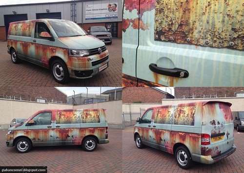Tidak perlu bimbang, ini bukan membuat kereta menjadi berkarat sebenar tetapi sekadar ditampal lapisan Vinyl. Clyde ‘s Wraps melapisi kereta van Volkswagen T5 Sportline 2014 dengan vinyl yang bergambar karatan. Tentu saja gambar tersebut benar-benar seakan asli sehingga kini dilihat dari kejauhan kereta itu kelihatan seperti besi buruk.