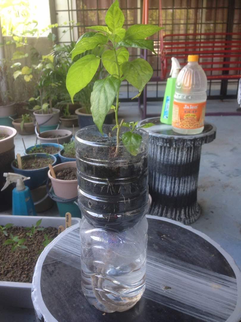 Hari ini sempat pindahkan 8 pokok cili api akar dan 4 pokok cili api bara dari bekas semaian beroda ke sistem hidroponik bekas botol air minuman 7.2.18 : 27.2.18 :