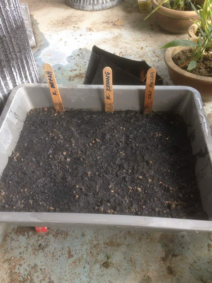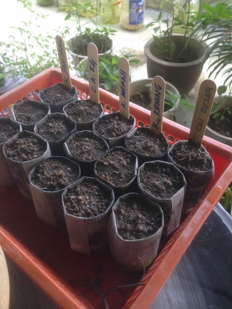 Semaian cili besar, cili api kampung, kapsikum kuning, kapsikum merah dan kacang panjang menggunakan pot semaian dari suratkhabar. Benih cili dan kapsikum direndam 10 jam. 15.4.18 : 24.4.18 :