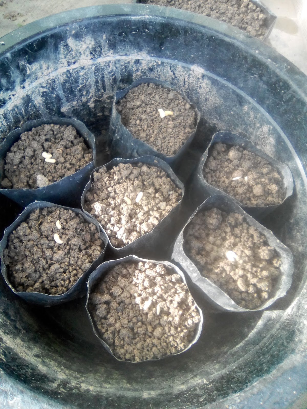 Semaian cili besar, cili api kampung, kapsikum kuning, kapsikum merah dan kacang panjang menggunakan pot semaian dari suratkhabar. Benih cili dan kapsikum direndam 10 jam. 15.4.18 : 24.4.18 :