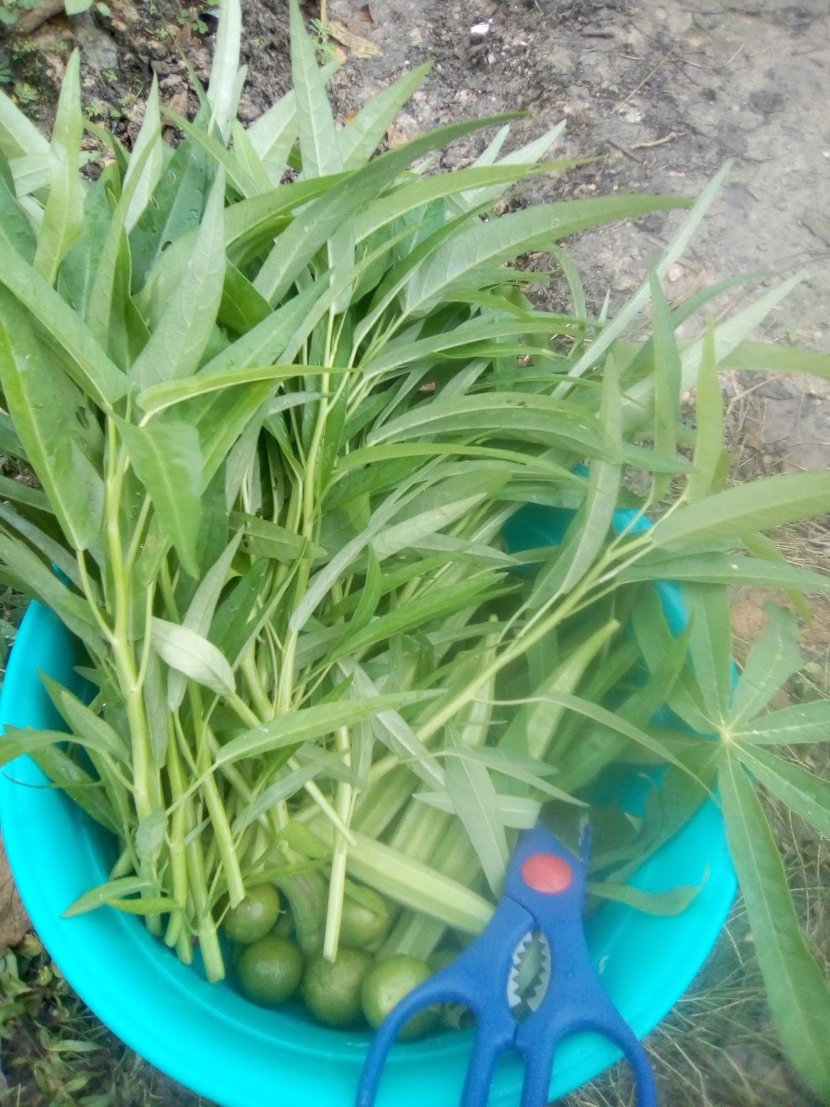 Antara hasil tuaian kebun bandar tepi rumah hari ini, pucuk ubi, bendi, limau kasturi dan kangkung