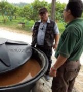 Penggunaan baja organik dilakukan oleh petani ini dimana beliau ada selalunya menggunakan IMO dan FPJ diladangnya. Beliau mengutip semua buah-buah jambu yang telah masak ranum dan gugur ditanah dan diproses menjadi baja IMO didalam tong 6,000 gelen yang diletakkan dibawah bangunan pemprosesan baja organik ditengah kebunnya. Bahan asas Molases digunakan d=sebagai salah satu bahan asas untuk menghidupkan bateria dalam baja organiknya. Penulis blog dapati cecair tersebut sudah sedia untuk digunakan apabila tong dibuka jelas ia menjadu larutan sebati. Penggunaan baja ini juga dilakukan sebulan sekali terhadap pokok matang dikebunnya dan beliau dakwa kaedah ini memang signifikan untuk hasilkan buah jambu batu yang manis dan rangup. Kemanisan buah tropika banyak bergantung kepada nutrian berasaskan organik dimana ia menyebabkan pokok hidup subur dan buahnya akan menjadi manis. Disyorkan agar En Chong dapat meningkatkan lagi pengetahuan dan kemahiran mengenai aplikasi baja mikrob dengan menghadiri kursus lanjutan bagaimana menyediakan baja organik sama ada dialam negara atau luar negara.