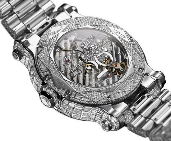 The diamond-set white dial comprises rhodium-plated 18-karat white gold hour-markers and Roman numerals 3 and 12. Hour and minute hands are also rhodium-plated. The Happy Sport Diamantissimo has an exhibition case back with a transferred anniversary inscription.