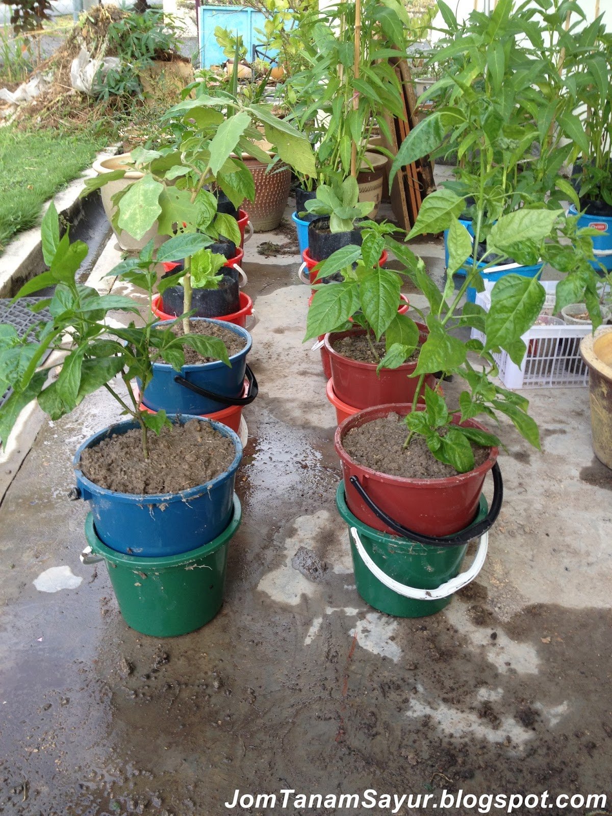 | 3 pokok cili dan 1 pokok terung dipindahkan ke NutriPot Ringkas ini dan disiram air baja ( baja biji yang dicairkan ) |