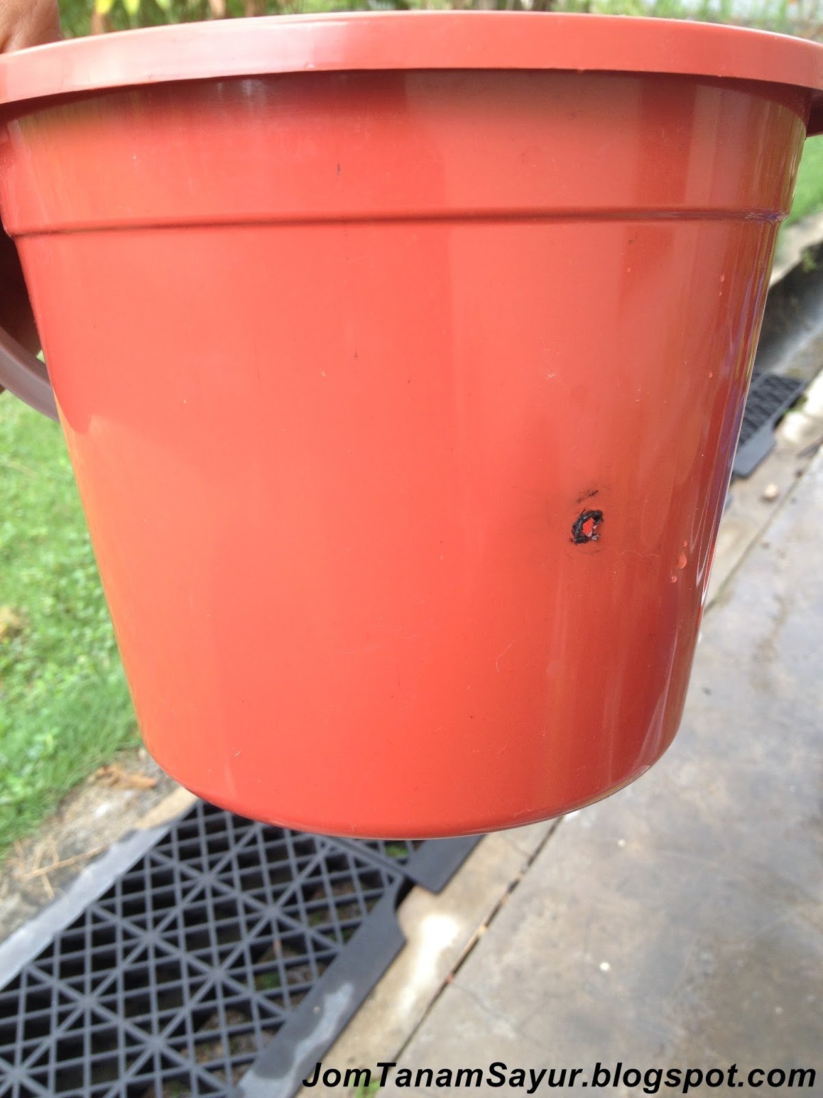 | Lubang kecil untuk air lebihan keluar dibuat pada baldi yang bertindak sebagai takung air |