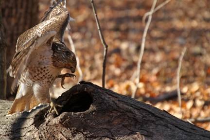 Red-tail hawk trying to get a squirrel out of a knot hole in a log, where it had taken refuge. Photo by National Wildlife Photo Contest entrant Cara Litberg.