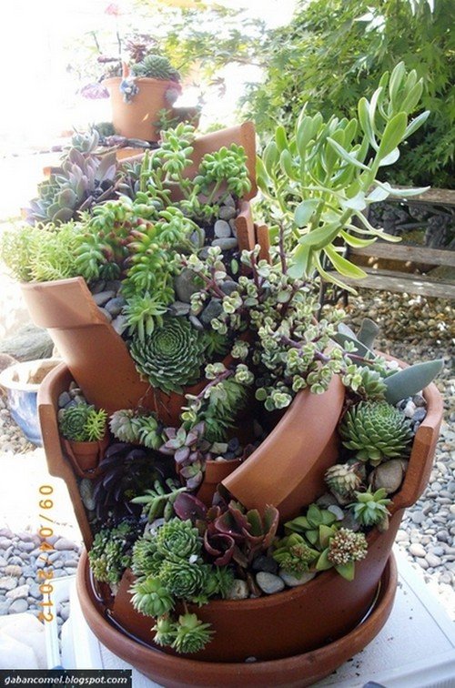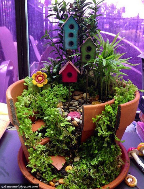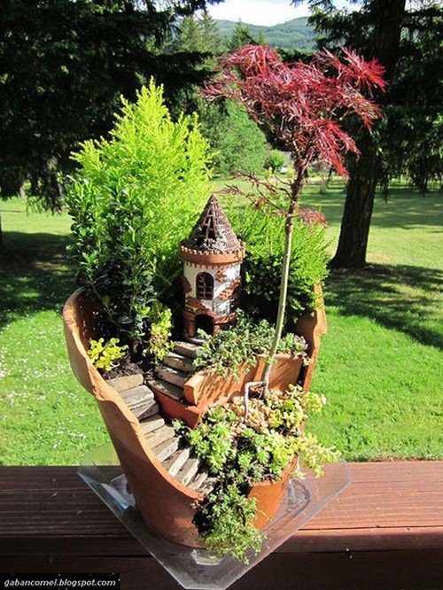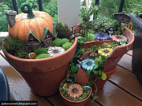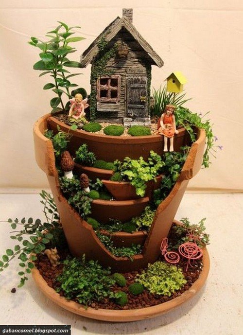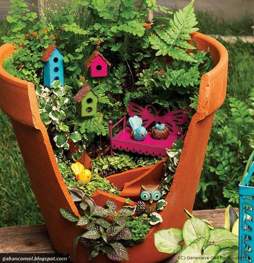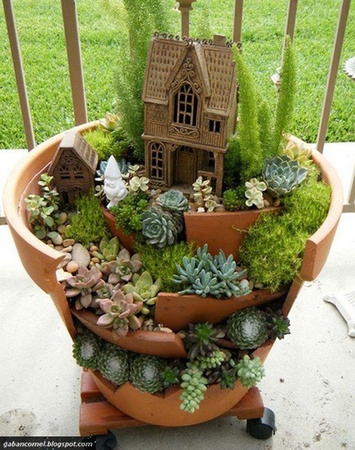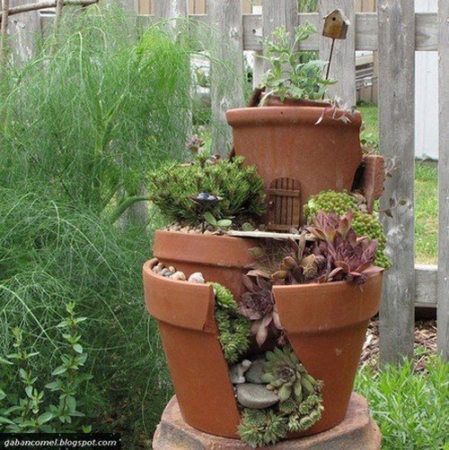 Dengan pecahan pasu-pasu bunga, pasu disusun menjadi seakan rumah untuk pelbagai tanaman dan bunga cantik. Bahkan anda boleh menambah figurin kecil seakan penghuni pasu bunga tersebut. Lihat pasu-pasu cantik berikut ini, siapa tahu jadi inspirasi menghias taman bagi anda.