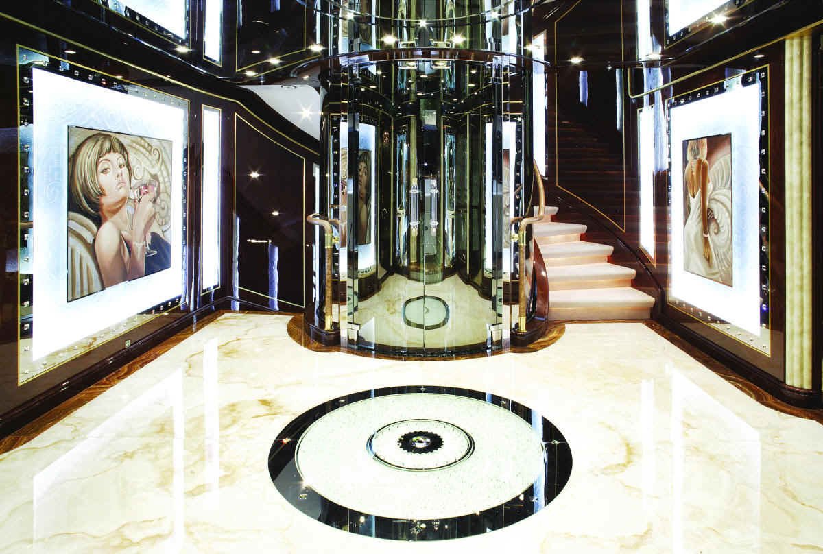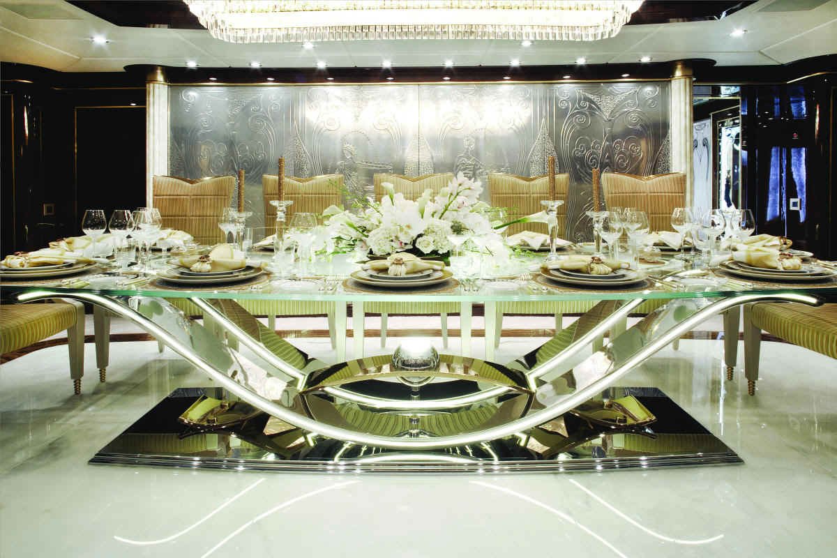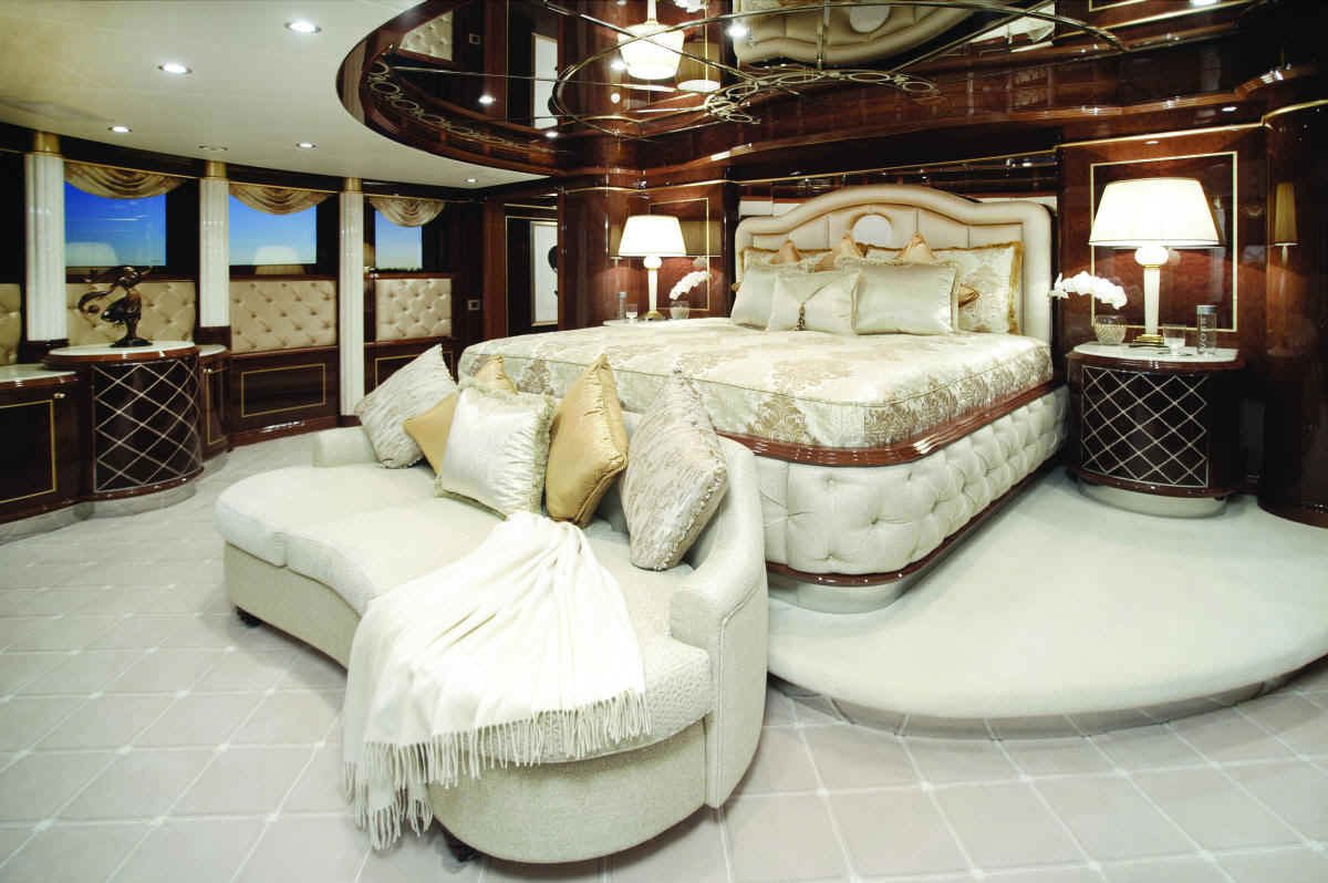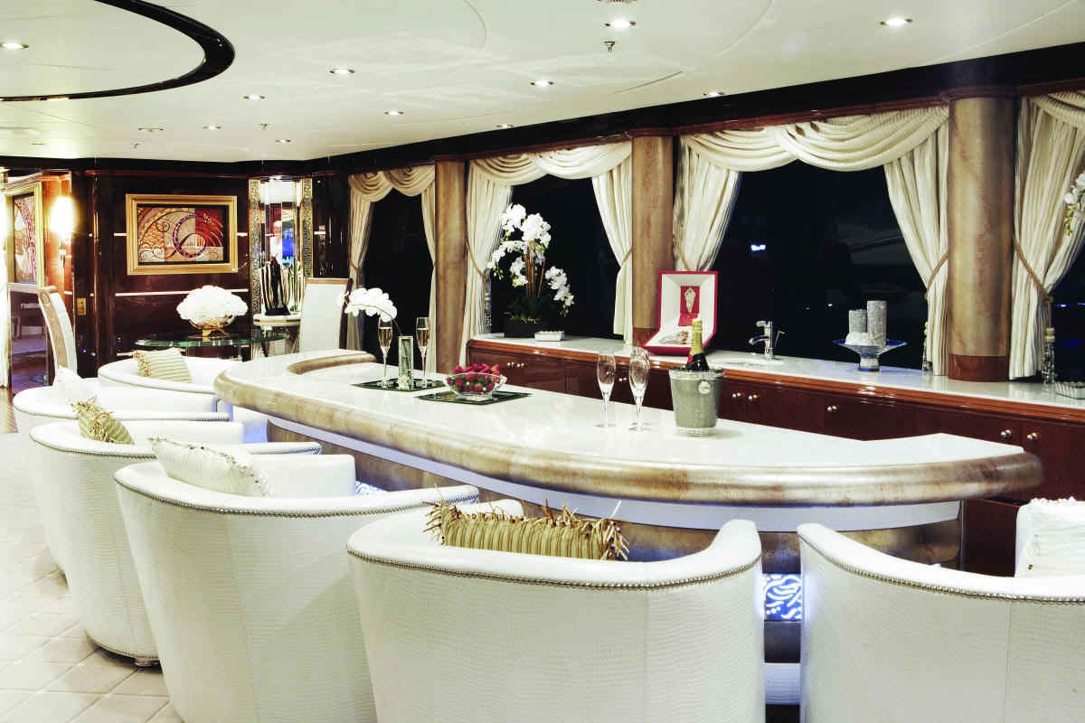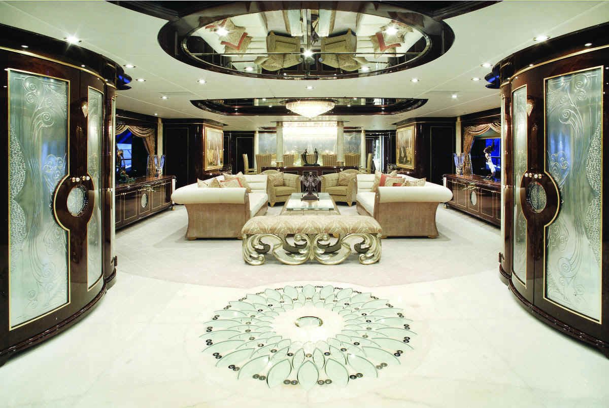 Evan K. Marshall/Usonia V, a London based interior specialist who has already designed several yacht interiors for Mr. and Mrs. Staluppi, was in charge for the interior decor and completely custom furnishings on the yacht. Marshall has used cream and white, quality furnishings, Italian marble, onyx, Madrona burlwood, gold and silver leaf, mother of pearl and Marieux crystal, with great attention paid to every detail to achieve maximum visual impact. If we try to describe her beauty in detail, it would take a couple of hours.
