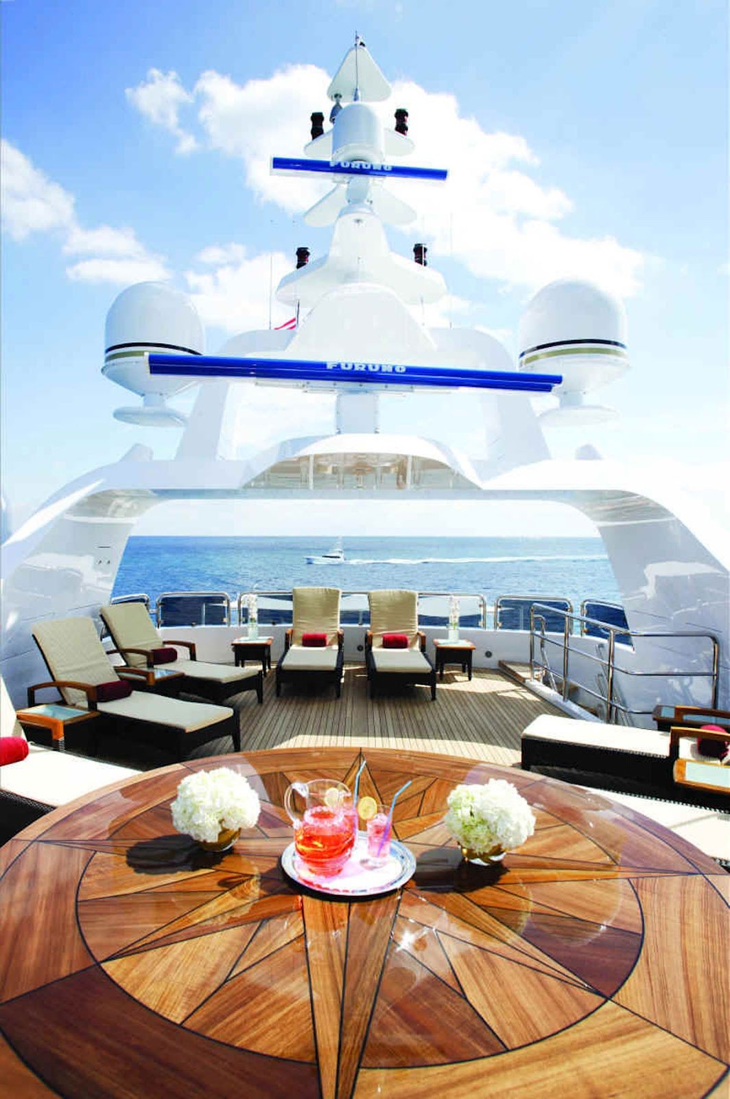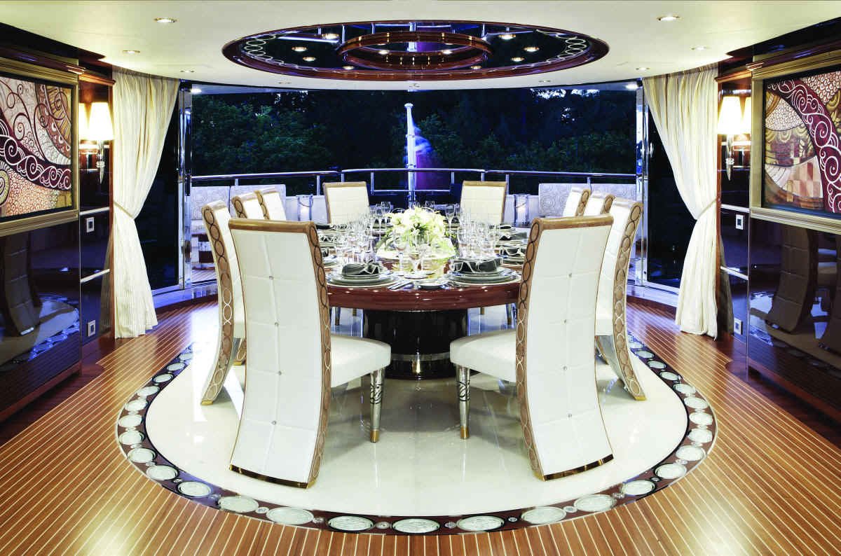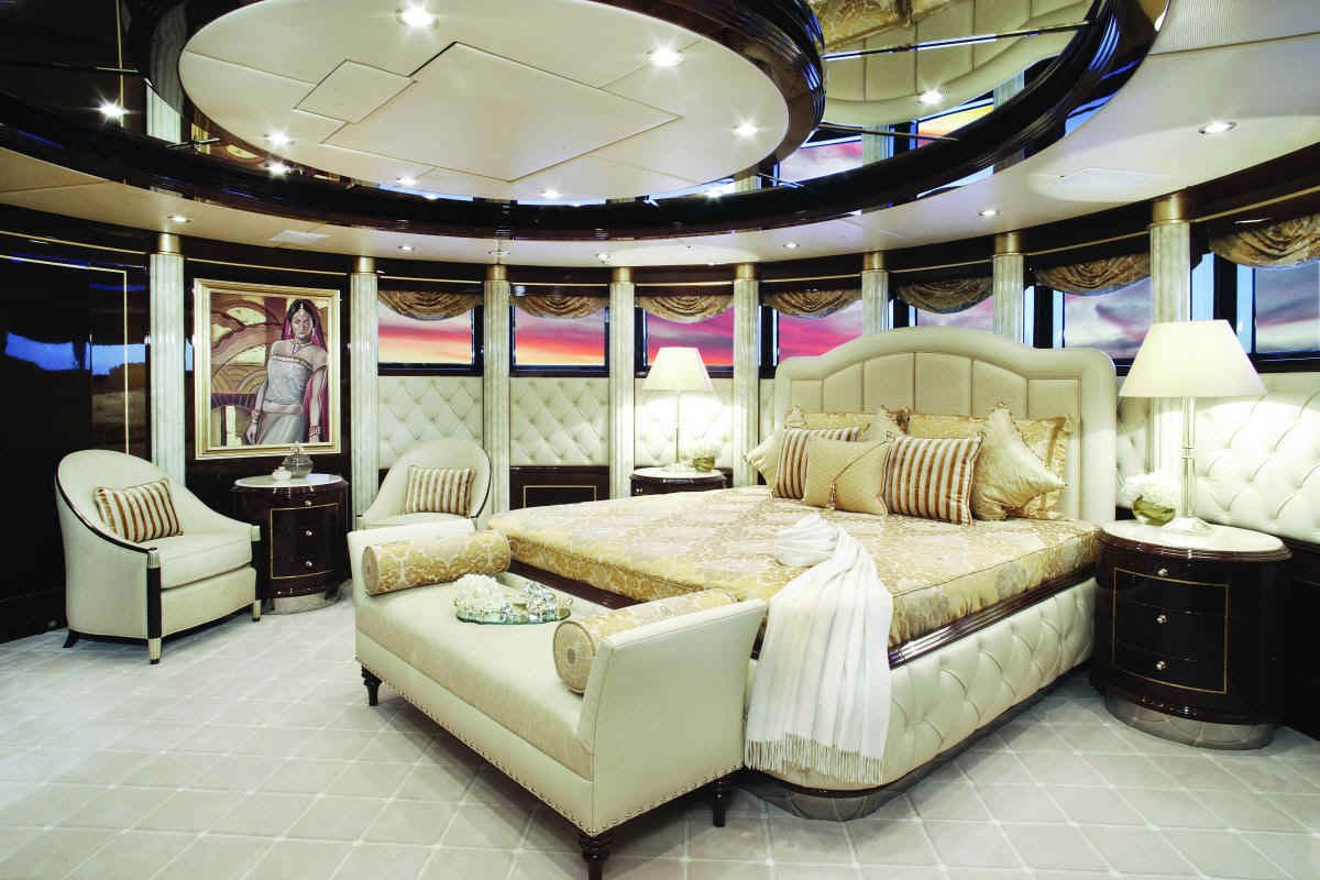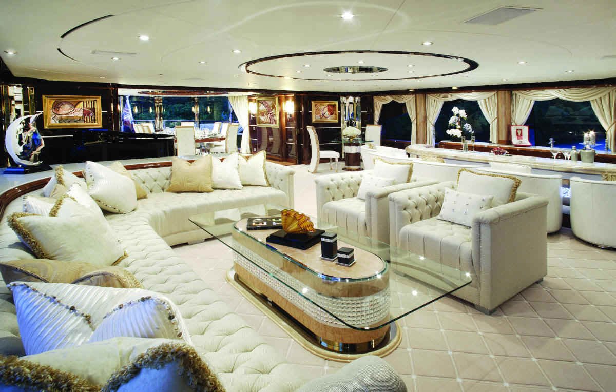 Evan K. Marshall/Usonia V, a London based interior specialist who has already designed several yacht interiors for Mr. and Mrs. Staluppi, was in charge for the interior decor and completely custom furnishings on the yacht. Marshall has used cream and white, quality furnishings, Italian marble, onyx, Madrona burlwood, gold and silver leaf, mother of pearl and Marieux crystal, with great attention paid to every detail to achieve maximum visual impact. If we try to describe her beauty in detail, it would take a couple of hours.
