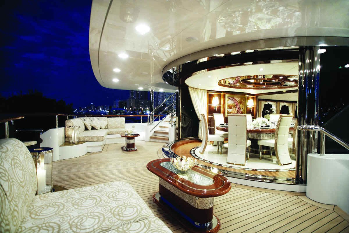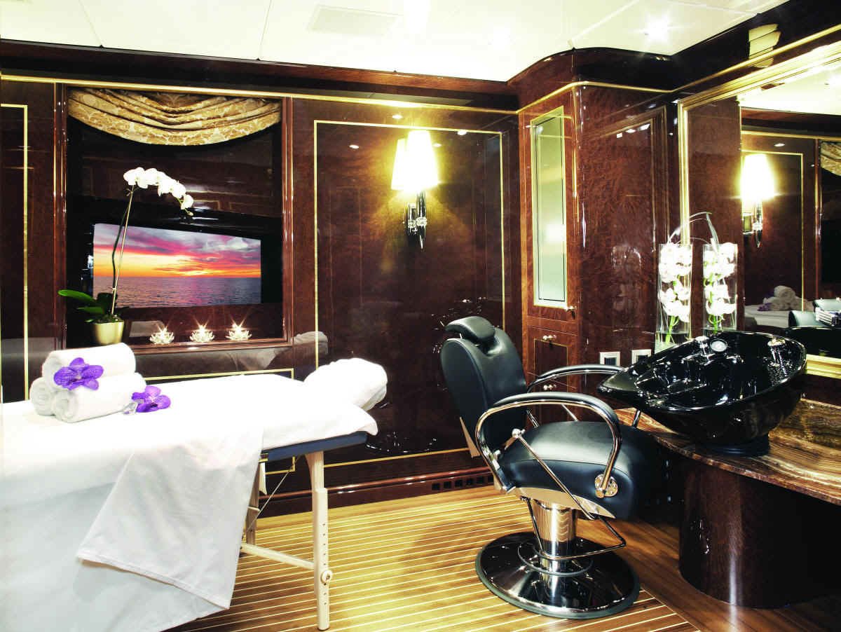 This superyacht has four decks (complete with an elevator) and can accommodate up to 12 charter guests in 6 cabins, formed by 4 guest cabins (3 doubles and 1 single) located on the lower deck, and 2 full beam panoramic master staterooms (one with an office and both with dressing areas and walk-in closets) forward on the upper deck, both with a 180° view sea view. There are also a full sky lounge, various shaded deck spaces, and an additional sun deck that offers an unparallel view and a large Jacuzzi overlooking a raised dining area and marble topped wet bar with a television. The main deck has a fitness room, sauna, and beauty parlor, which can all be opened to guests or sectioned off to be more VIP exclusive.
