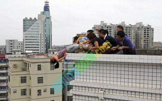 Foto dibawah ini memperlihatkan situasi penyelamatan Sheng Fi, seorang wanita yang ingin mencoba bunuh diri dari atap gedung setinggi 30 meter. Kakinya dipegang erat oleh keluarga serta petugas penyelamat. Nyawa wanita ini akhirnya berhasil diselamatkan, dan semua keluarganya menangis bahagia.