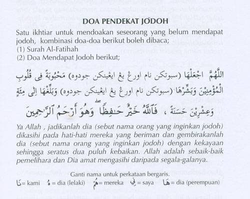Ya Allah… Cukuplah engkau sahaja yang menjadi pemeliharaku… Di dunia dan di akhirat… Dengarlah rintihan dari hamba Mu yang daif ini… Jangan engkau biarkan aku sendirian… Di dunia ini mahupun di akhirat… Menjuruskan aku kearah kemaksiatan dan kemungkaran… Maka kurniakanlah aku seorang pasangan yang beriman… Supaya aku dan dia sama2 dapat membina Kesejahteraan hidup… Ke jalan yang Engkau redhai… dan kurniakanlah padaku keturunan yang soleh….