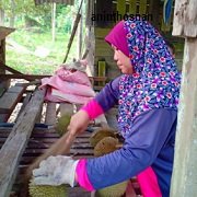 Puan Saniah merupakan seorang pekebun durian tradisional dengan mempunyai 24 buah pokok durian yang sedang gugur buahnya ketika tinjauan dilakukan penulis. Rombongan ini diikuti sama oleh Penghulu Mukim, Penolong Pegawai Pertanian Daerah Maran, APT Maran dan juga beberapa penduduk kampong. Setibanya di pintu pagar didapati buah durian sudah bertaburan diatas tanah dan kami mengumpulkannya sebelum ia dimasukkan kedalam kereta sorong. Sebanyak 10 biji dikumpulkan pada bahagian hadapan kebun dan 15 biji lagi dibahagian belakang kebun. Menurut Pn Saniah, ada beberapa jenis durian kampong yang terdapat dikebunnya akan tetapi dakwanya pokok jenis ‘durian belimbing’ yang beliau paling suka kerana kualiti isi yang kuning, manis dan lemak rasanya. Pada beliau pokok durian belimbing ini (ada 3 pokok) buahnya akan diasingkan dengan buah durian daripada pokok lain dan dijadikan satu indikator semasa membuat grading untuk jualan. Puan Saniah juga mahir membelah buah durian dengan parang (Sila lihat foto disebelah) dimana didalam beberapa minit sahaja lebih 3 biji berjaya dibelah dan dihidangkan kepada kami semua untuk memakannya. Memang sungguh unik apabila buah durian kampong yang baru ‘berdebub’ jatuh diatas tanah dikebun durian ini terus dibelah walau pun terpaksa ‘berperang’ dengan nyamuk yang terus menghisap darah penulis blog. Nyamuk disini pun memilih mangsa dimana perokok mereka tidak diganggu dengan ada juga kemungkinan darah mereka tidak disukai nyamok.