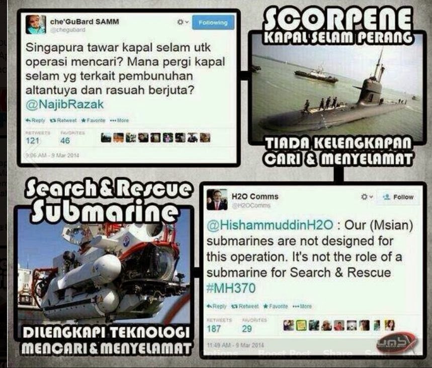 Jadi ingin kami jelaskan tidak timbul isu kenapa Scorpene tidak digunakan untuk operasi mencari MH370 . Tiada keperluan untuk kapal selam TLDM itu dihantar ke Teluk Siam sedangkan aset yang lebih sesuai dan praktikal sudahpun digunakan. Kenapa perlukan pemotong laser sekiranya gunting sudah cukup sempurna bagi menjalankan tugasan.
